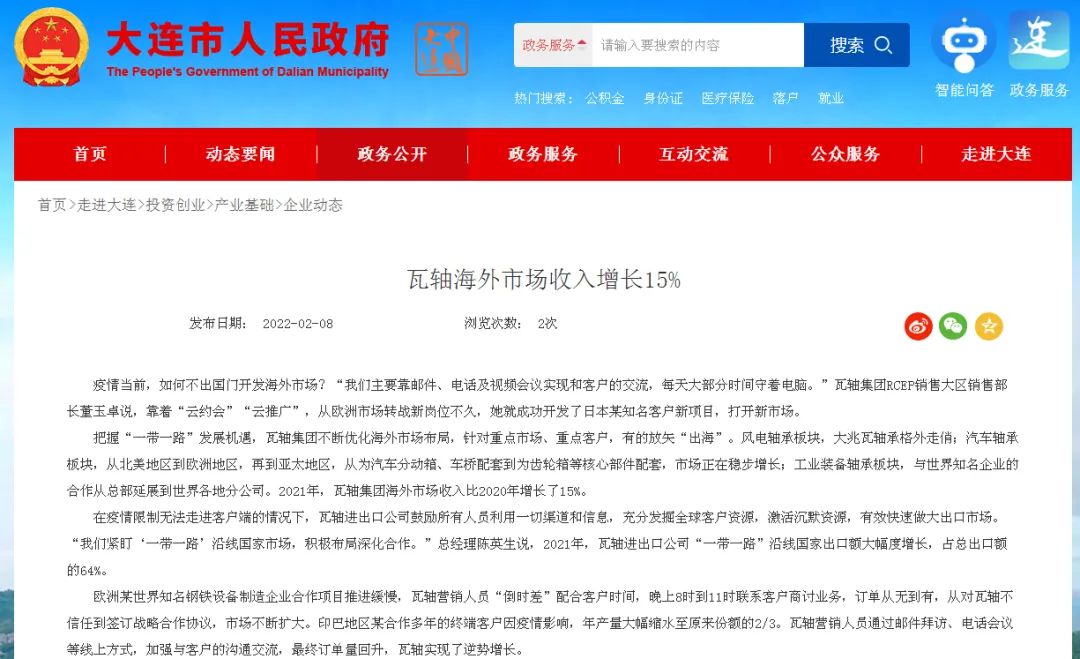 把握“一帶一路”發展機遇,瓦軸集團不斷優化海外市場布局,針對重點市場、重點客戶,有的放矢“出海”。風電軸承板塊,大兆瓦軸承格外走俏;汽車軸承板塊,從北美地區到歐洲地區,再到亞太地區,從為汽車分動箱、車橋配套到為齒輪箱等核心部件配套,市場正在穩步增長;工業裝備軸承板塊,與世界知名企業的合作從總部延展到世界各地分公司。2021年,瓦軸集團海外市場收入比2020年增長了15%。